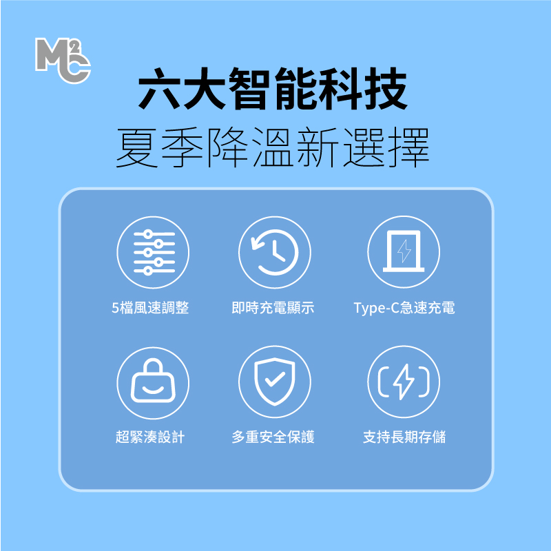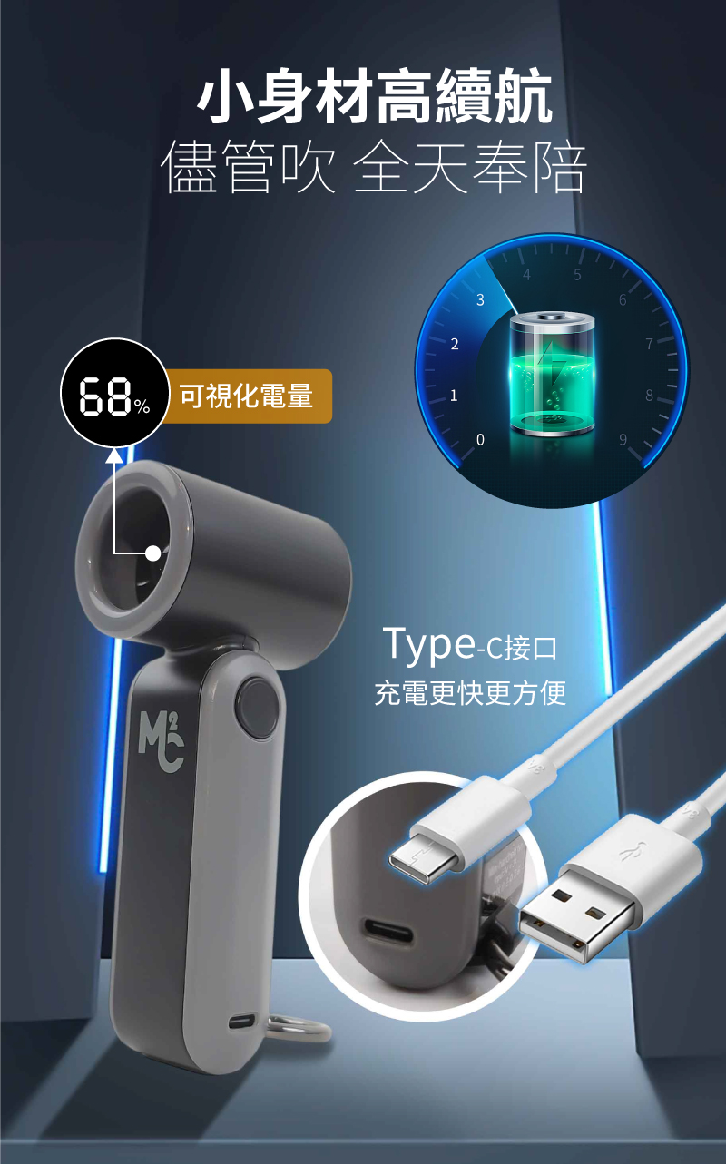 5檔風速調整 超緊湊設計 即時充電顯示 多重安全保護 Type-C急速充電 支持長期存儲